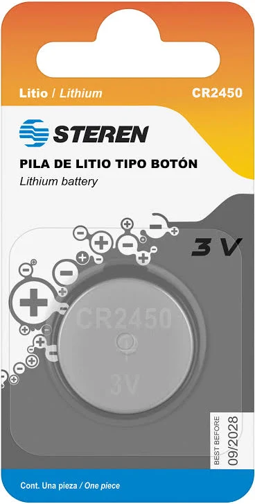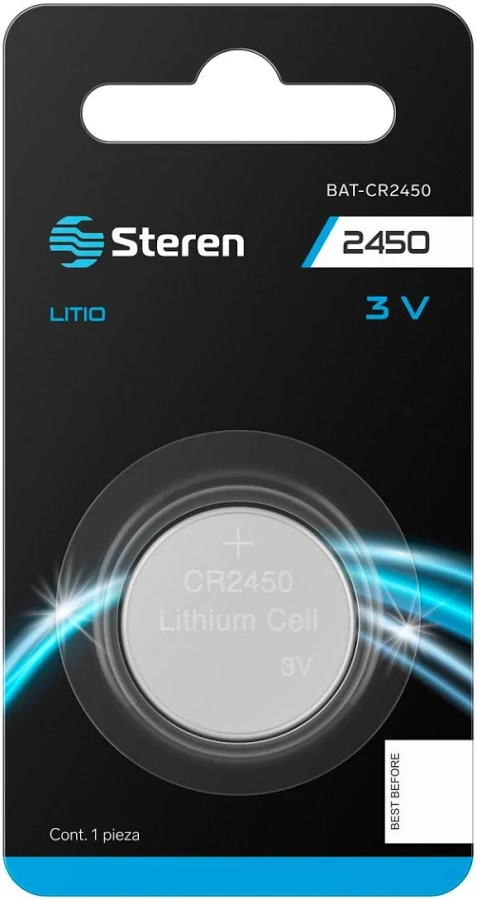 La Steren Pila de Litio Botón CR2450 es una batería de un solo uso con tecnología de litio y capacidad de 580 mAh. Su voltaje es de 3 V, mientras que su diámetro alcanza los 2. 45 cm y su altura se sitúa en los 5 mm. Esta pila viene en presentación individual, incluyendo únicamente una unidad por pa