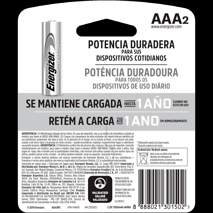 Las pilas Energizer Recharge AAA brindan energía recargable de alto rendimiento y duran hasta 4 veces más en cámaras digitales, comparadas con las pilas alcalinas (los resultados pueden variar). Mantienen la carga hasta 1 año y pueden ser recargadas cientos de veces. ¡Están listas para usar! Elige e