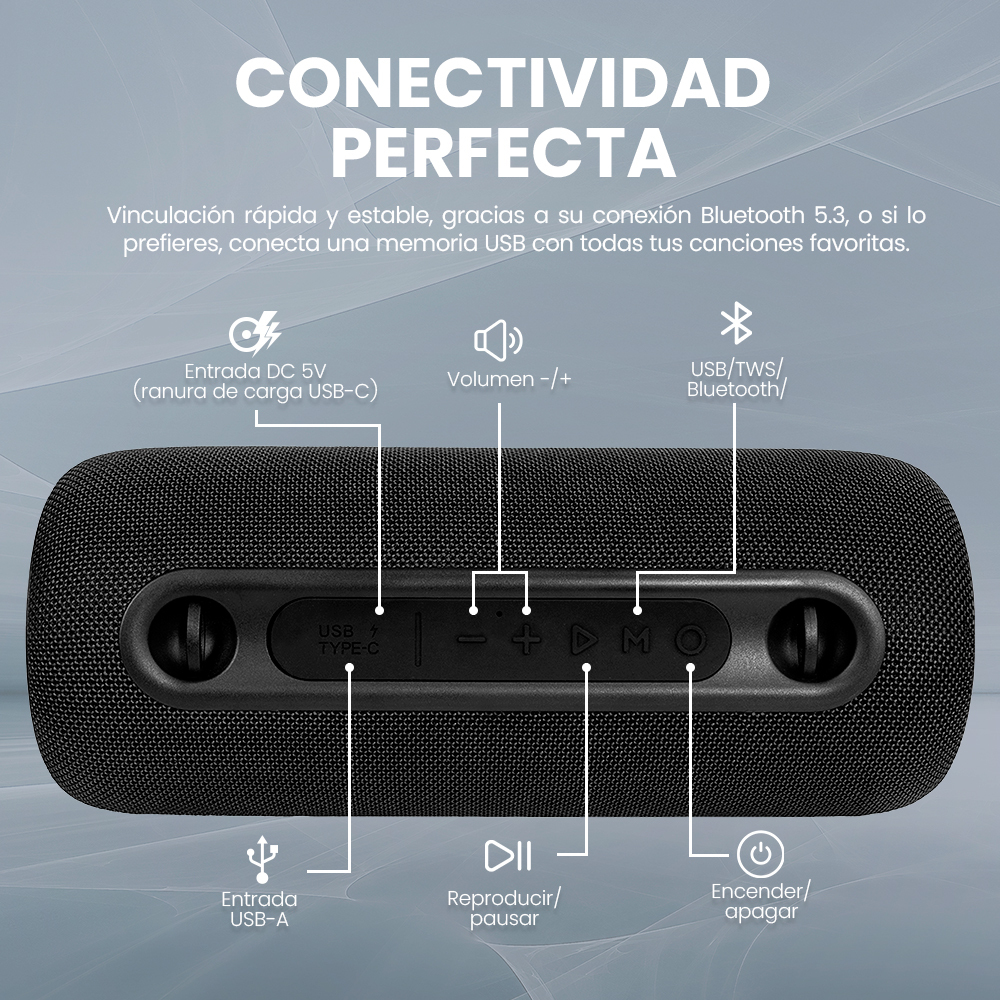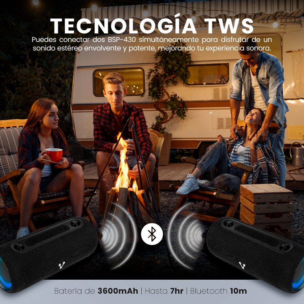 BOCINA VORAGO BSP-430 BLUETOOTH / USB / AROS LUZ RGB / TWS / 26W RMS CON HASTA 7 HRS AUTONOMIA TERMINADO EN TELA –