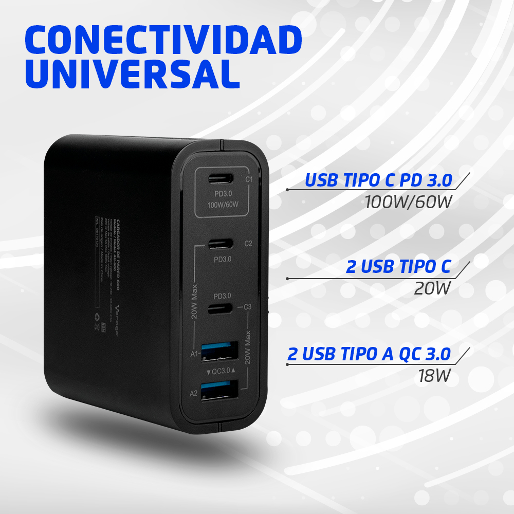 CARGADOR DE PARED VORAGO AU-600 100W, 2/USB-A 3.0, 3/USB-C 3.0, CARGA RAPIDA, COLOR NEGRO