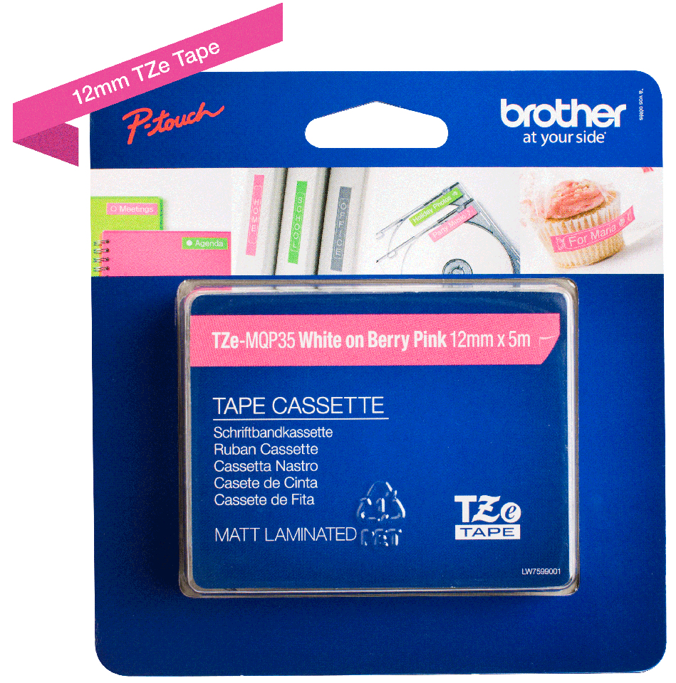 CINTA BROTHER TZEMQP35, LAMINADA ESTANDAR TEXTO BLANCO FONDO ROSA, TZ, 12MM X 5 MTS