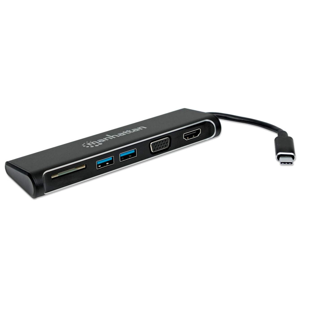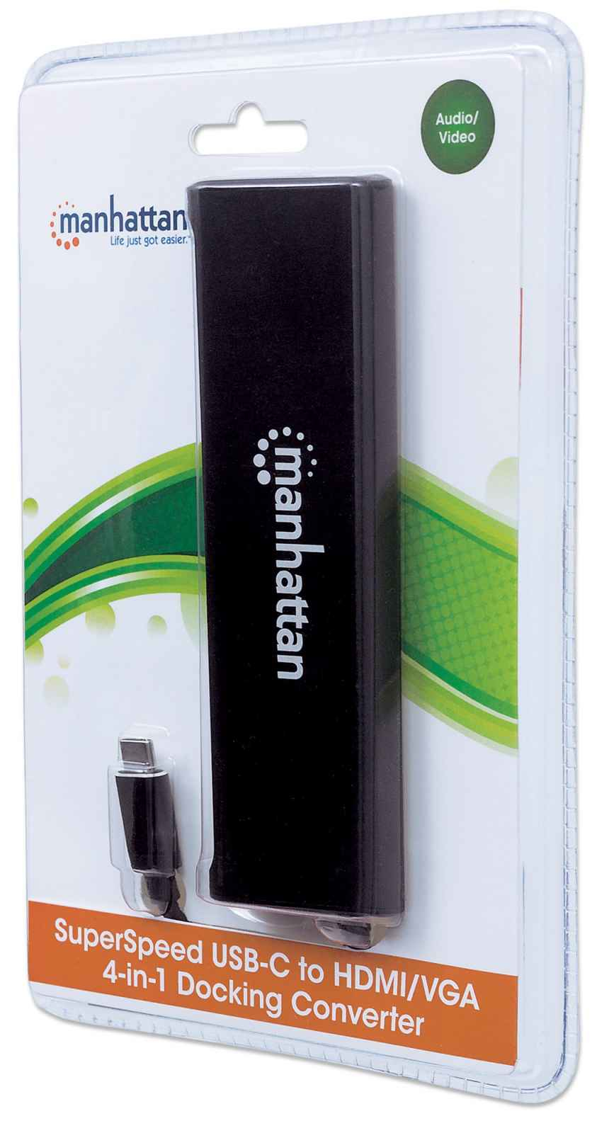 Manhattan Convertidor Docking USB-C Superspeed 4-en-1 a HDMI/VGA, Alámbrico, USB 3.2 Gen 1 (3.1 Gen 1) Type-C, Negro, SD, Aluminio, RoHS, CE, FCC, WEEE