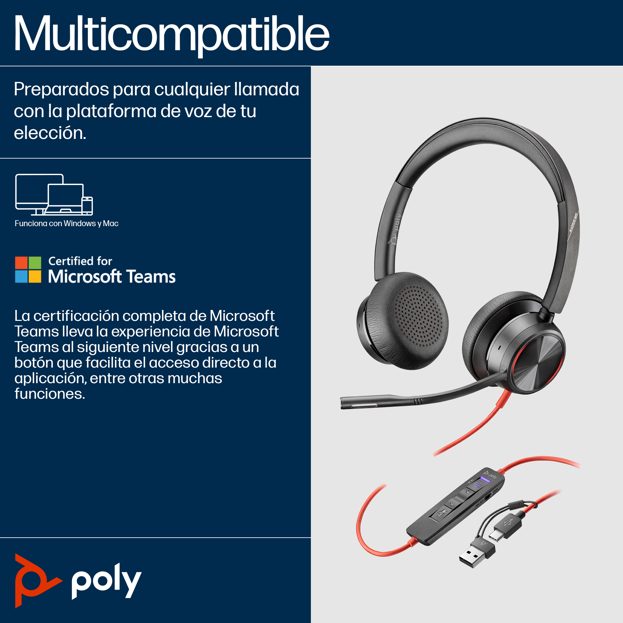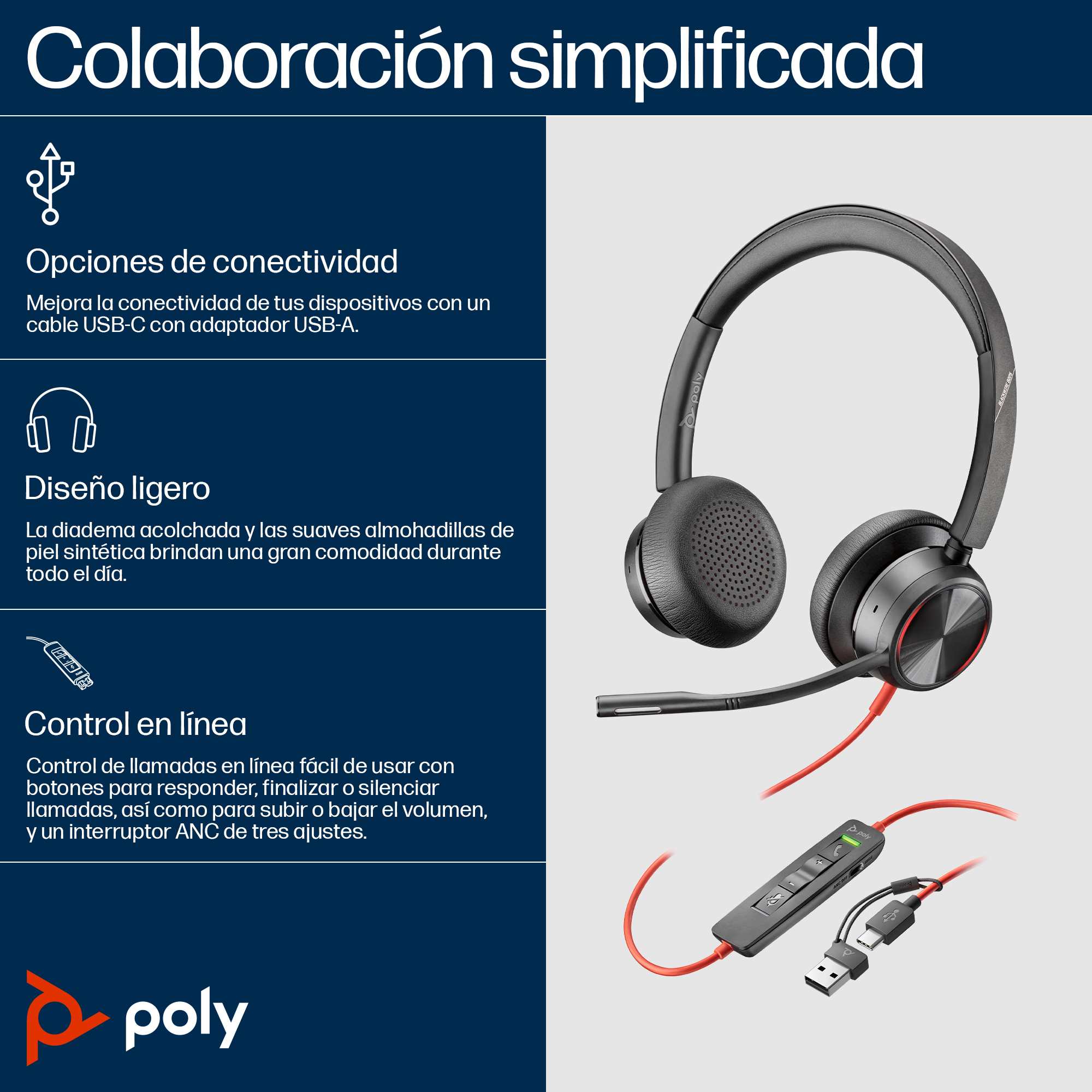 HP Poly Auriculares estéreo USB-C Poly Blackwire 8225 + adaptador USB-C/A, Alámbrico, Oficina/Centro de llamadas, 187 g, Auriculares, Negro