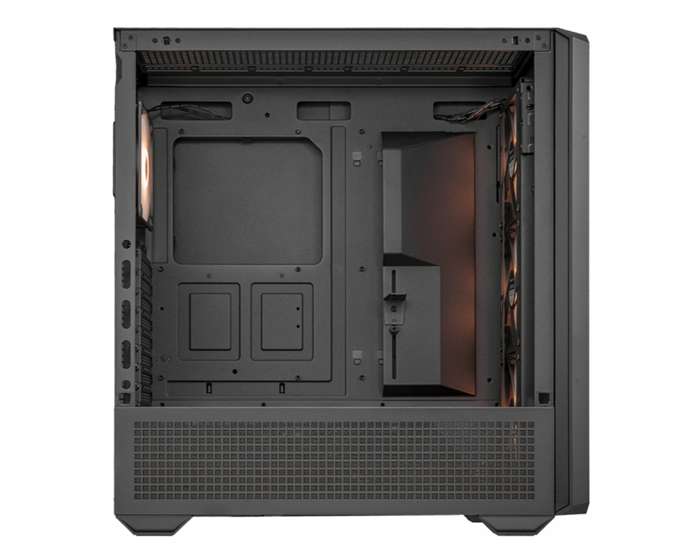 Despídete de los equipos calientes: la MX600 RGB está protegida contra el ascenso de las temperaturas, con ventilación omnidireccional completa que garantiza el máximo flujo de aire. (Las perforaciones cuadradas aumentan el flujo de aire en un 27% en comparación con los diseños circulares, ya que la superficie de un cuadrado es mayor que la de un círculo de diámetro equivalente).Dos estructuras angulares integradas, una en la base del panel frontal y otra en el lateral, orientan las corrientes de aire directamente hacia la CPU y la tarjeta gráfica con precisión láser, refrigerando los componentes más vitales donde más lo necesitan. Además, la cabina de la fuente de alimentación cuenta con una cubierta lateral ventilada para optimizar la entrada de aire, a la vez por su altura de 110 mm mejora el espacio libre para una circulación eficiente del aire.