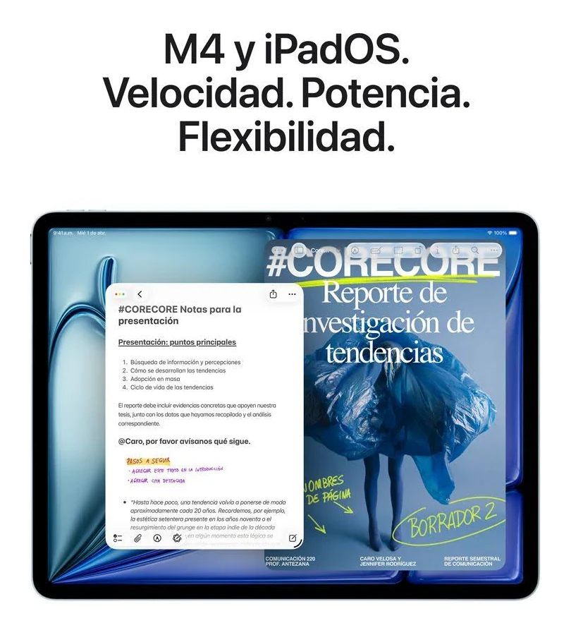 Diseñado para Apple Intelligence y ahora con los superpoderes del chip M4 de Apple. Es tan poderoso como accesible. Viene con una espectacular pantalla Liquid Retina, cámara frontal Center Stage de 12 MP para videollamadas increíbles, iPadOS y conexiones Wi-Fi 72 y 5G ultrarrápidas. Como funciona con el Apple Pencil Pro, el Magic Keyboard para el iPad Air y más, puedes hacer varias tareas al mismo tiempo, estudiar, trabajar, jugar y crear con facilidad.