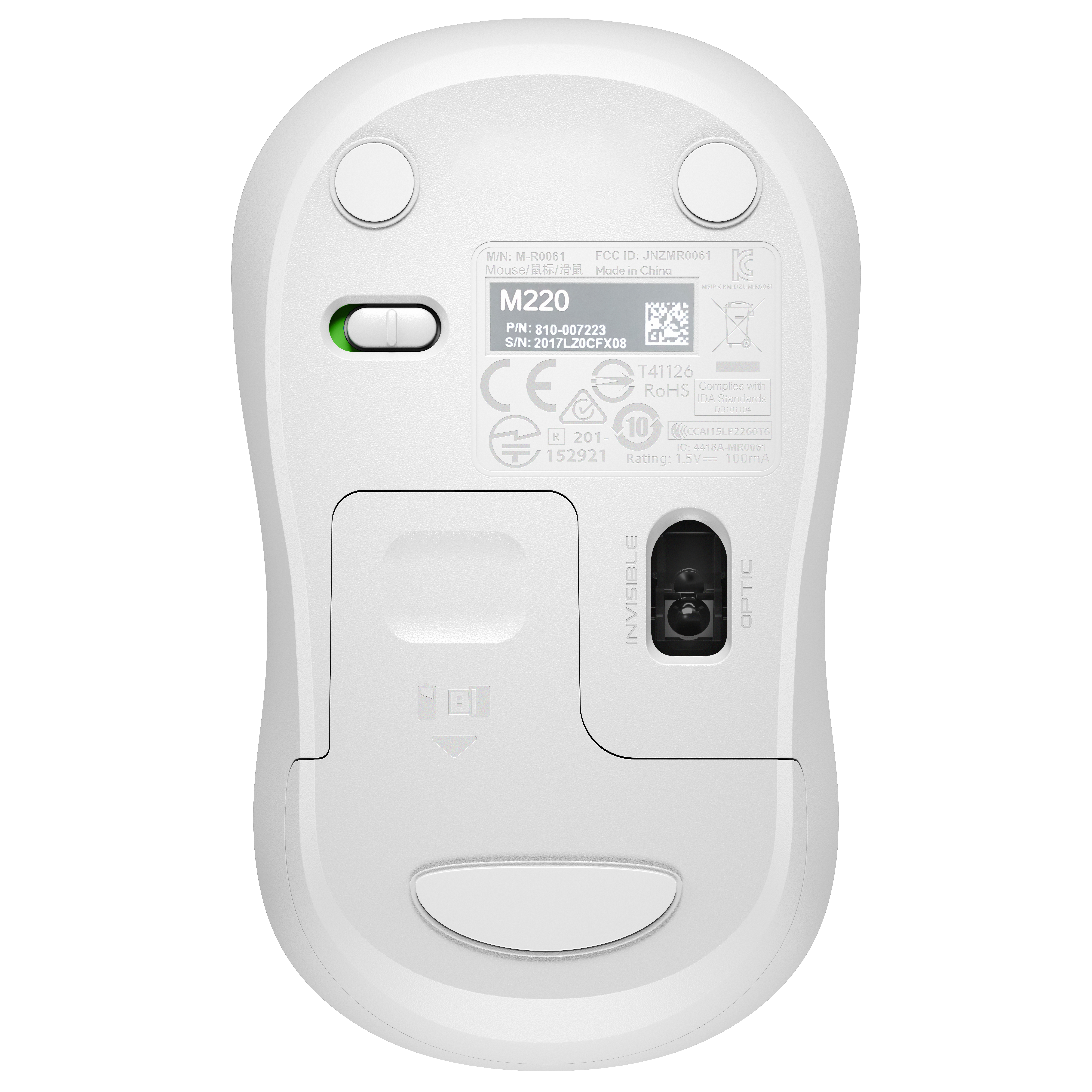 Logitech M220 SILENT. Factor de forma: Ambidiestro. Tecnología de detección de movimientos: Óptico, Interfaz del dispositivo: RF inalámbrico, Resolución de movimiento: 1000 DPI, Cantidad de botones: 3, Tipo de desplazamiento: Rueda. Fuente de energía: Baterías. Color del producto: Blanco