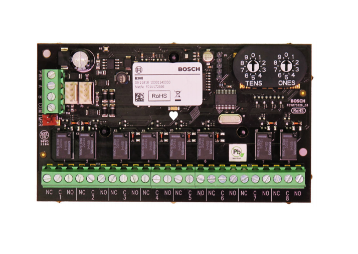 El módulo de ocho salidas B308 es adecuado para aplicaciones que requieren que las salidas de tipo C puedan hacer funcionar sistemas auxiliares o para mostrar el estado del sistema de incendios en anunciadores remotos. El B308 puede interactuar con componentes de edificios como aire acondicionado y calefacción, aberturas de bloqueos de puertas y presurización de huecos de escaleras para lograr el control y la monitorización completa del sistema.