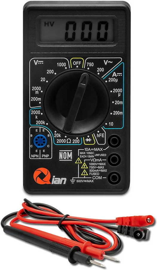 El Qian Multímetro Digital QAD-90011 es un dispositivo de medición portátil que cuenta con una pantalla LED diagonal de 8. 89 cm (3. 5") y un peso ligero de 108 g, lo que lo hace fácilmente transportable para su uso en diferentes lugares. Con una anchura de 70 mm y una altura de 126 mm, este multímetro digital tiene capacidad para soportar una batería y se coloca cómodamente en la mano del usuario gracias a su diseño ergonómico compatible con multímetros manuales. Este producto ofrece un intervalo de humedad relativa para funcionamiento entre el 0% y el 80%, así como también puede operar dentro del rango altitudinal desde los cero hasta los 85 m sobre el nivel del mar. Además, posee un periodo garantizado por el fabricante durante un año completo. La fuente energética utilizada por este instrumento es mediante baterías, específicamente requiere solo una unidad tipo pila alcalina estándar con voltaje nominal igual a nueve volts (9V). En cuanto a sus capacidades técnicas, este multímetro digital permite medir resistencias eléctricas comprendidas entre los valores mínimos establecidos en doscientos ohmios (200 Ω) hasta alcanzar los dos millones (2MΩ). Asimismo, opera bajo temperaturas ambientales normales que oscilan entre cero grados Celsius (0°C) y cuarenta grados Celsius (40°C), mientras que su almacenamiento debe mantenerse dentro del rango térmico -10°C a +50 °C. Finalmente, cabe destacar que este modelo viene presentado en color negro mate e incluye todas las funciones necesarias para realizar mediciones precisas y confiables en diferentes entornos eléctricos. En resumen, el Qian Multímetro Digital QAD-90011 es una herramienta útil para cualquier profesional o aficionado que requiera medir resistencias eléctricas con precisión y facilidad de uso.