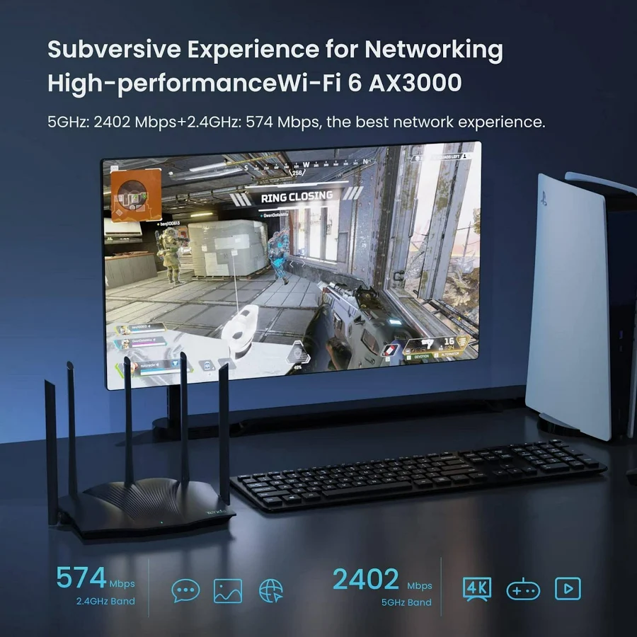 Router AX3000 WIFI 6 de doble banda para el hogar — Ideal para VR, juegos, transmisión 4K, IPTV y más. Con velocidades de Wi-Fi de hasta 3.0 Gbps (2402 Mbps en la banda de 5 GHz y 574 Mbps en la banda de 2.4 GHz) Puertos gigabit — Router WiFi con 4 puertos Gigabit, ideal para cualquier plan de inter