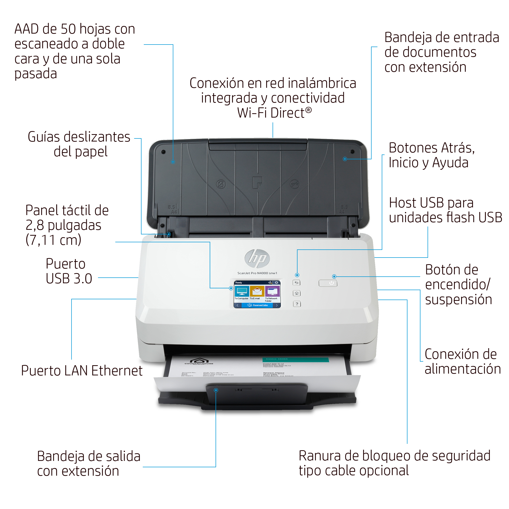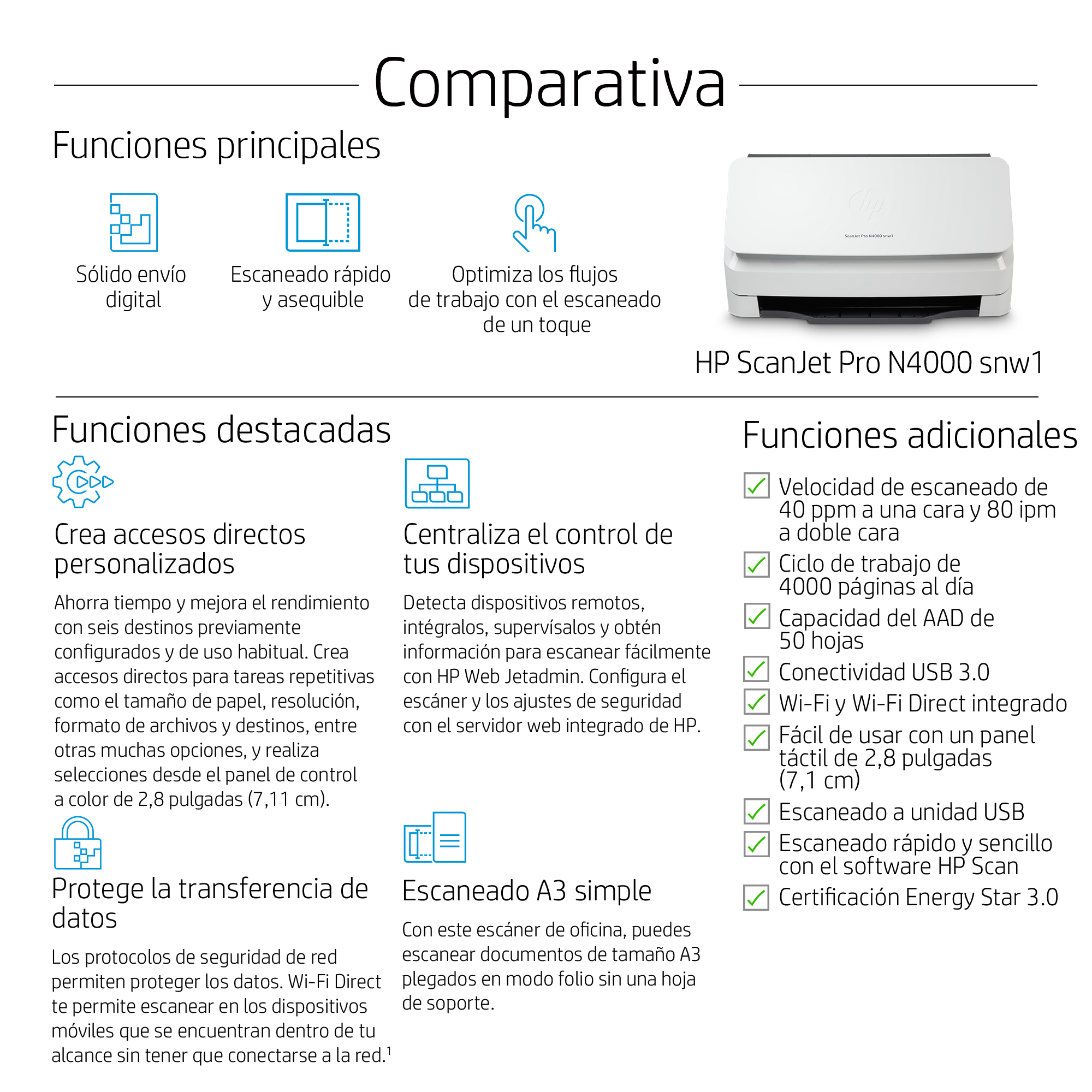 HP ScanJet Pro N4000 snw1, 216 x 3100 mm, 600 x 600 DPI, Escáner alimentado con hojas, Negro, Blanco, CMOS CIS, 4000 páginas
